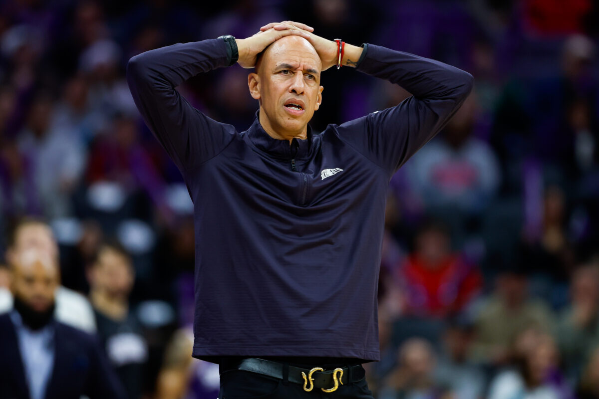 Dec 23, 2025; Sacramento, California, USA; Sacramento Kings head coach Doug Christie reacts after a play against the Detroit Pistons during the third quarter at Golden 1 Center. Mandatory Credit: Sergio Estrada-Imagn Images